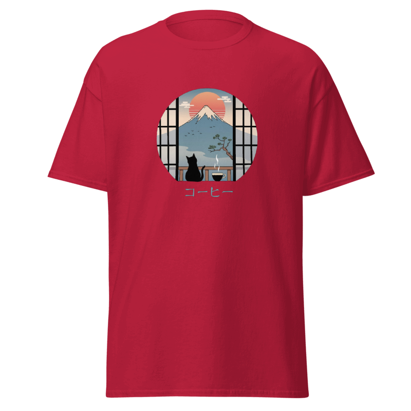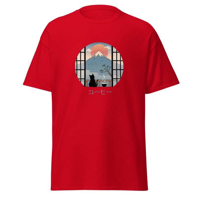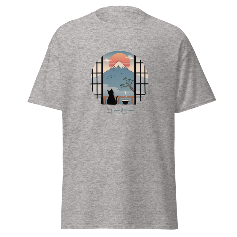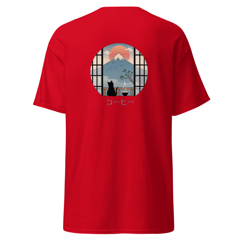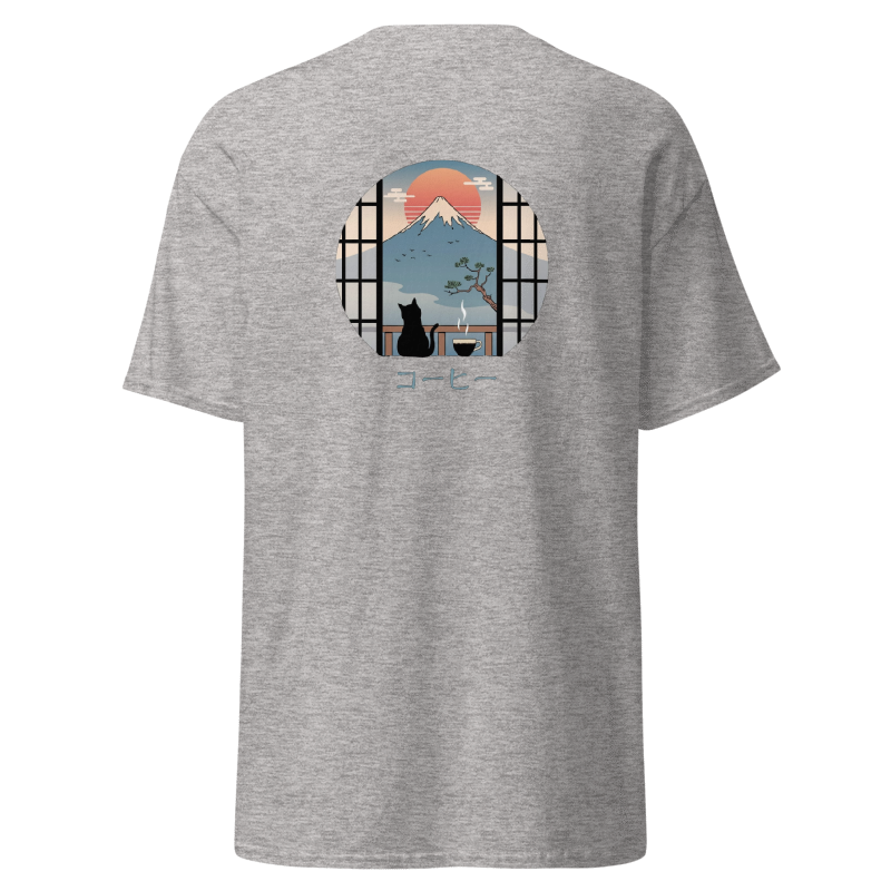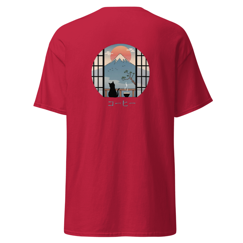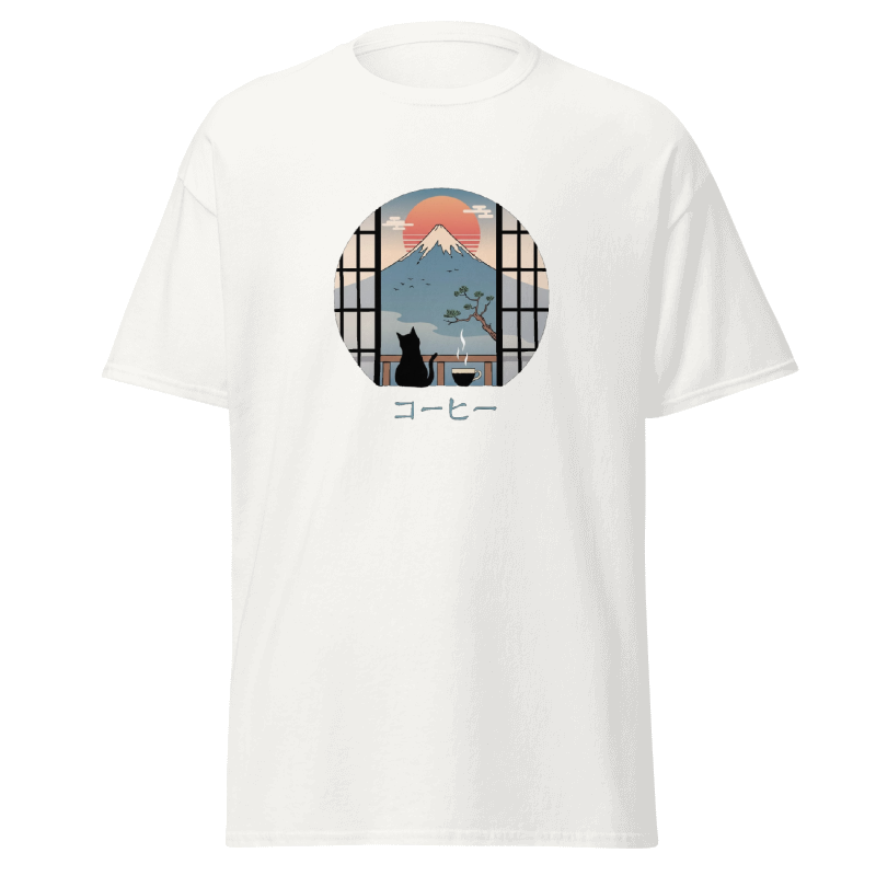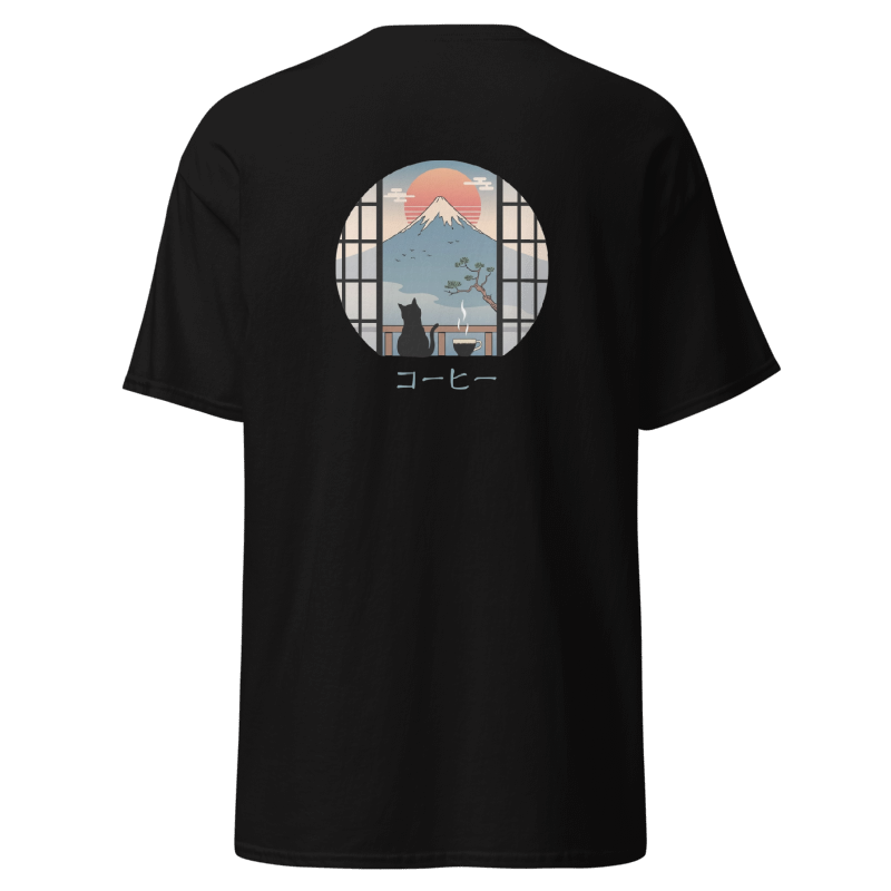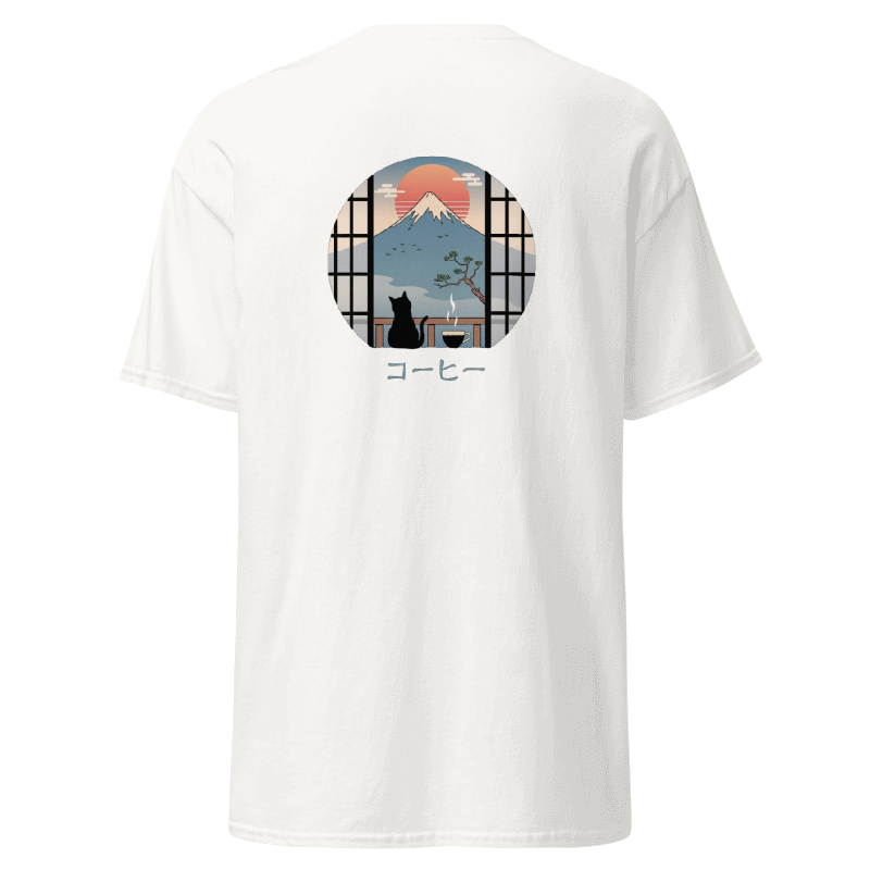 DTF Textil en espalda o pecho de gatito contemplando el Monte Fuji con la palabra コーヒー (Café) debajo